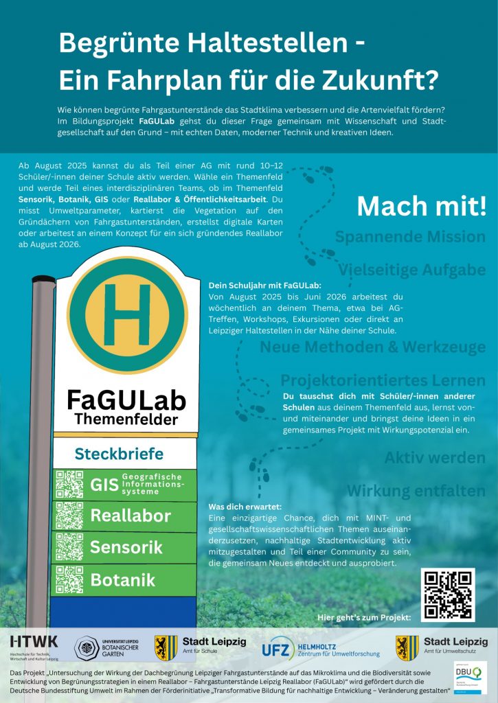 Wir haben als Schule die tolle Möglichkeit, am Projekt „Begrünte Haltestellen – Ein Fahrplan für die Zukunft?“ teilzunehmen. Gemeinsam mit Schüler/-innen anderer Schulen sowie Expert/-innen von Universität, Hochschule und Schulbiologiezentrum kannst du je nach deinen Interessen in den Bereichen Sensorik, Botanik, Geografische Informationssysteme oder Reallabor/Öffentlichkeitsarbeit tätig werden. Genauere Informationen zu den einzelnen Themengebieten findest du hier.