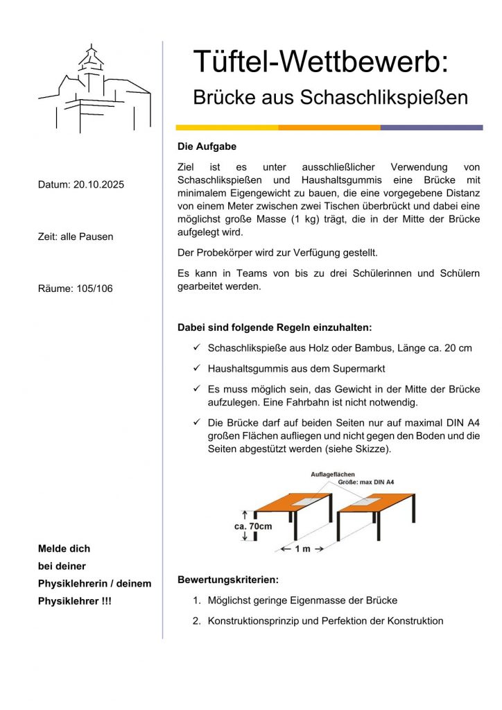 Wir suchen Schülerinnen und Schüler, die sich einer Herausforderung stellen wollen. Im Tüftel-Wettbewerb baut ihr eine 1 Meter lange Brücke aus Schaschlikspießen, die ein Gewicht von 1 Kilo tragen muss. Ihr glaubt das schafft ihr mit links? Dann meldet euch bei eurer Physiklehrerin/ eurem Physiklehrer und zeigt uns am 20.10.2025 deine Konstruktion.