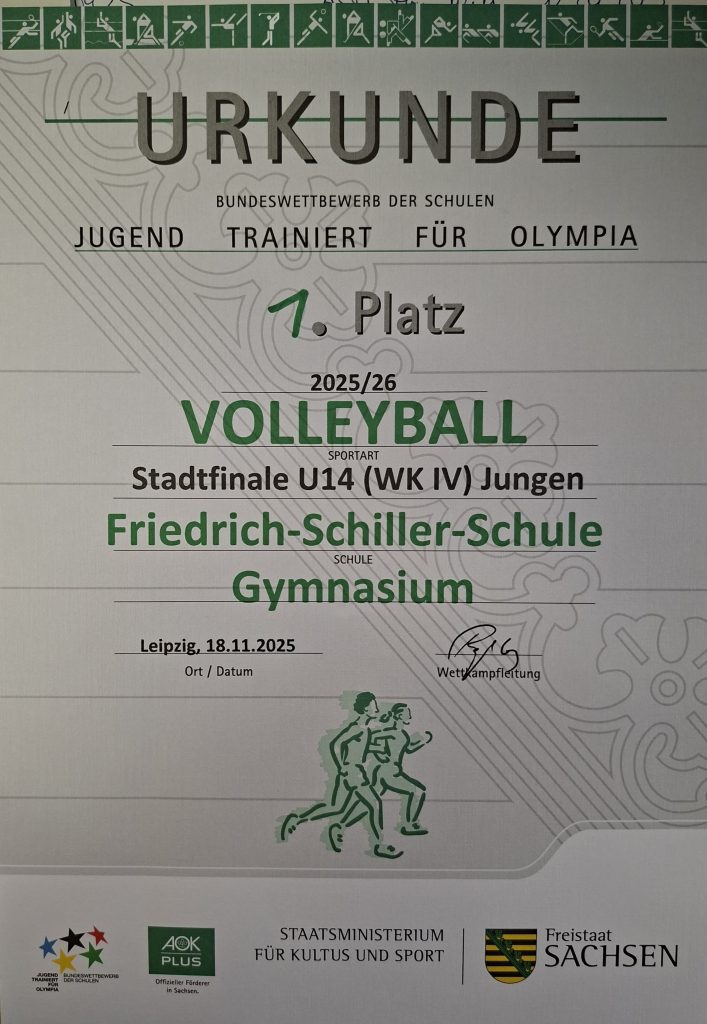 In der Rudi-Glöckner-Schule fand am 18.11.2025 ein spannender Volleyball-Wettkampf statt, an dessen Ende unser „Schiller“-Team das breiteste Lächeln im Gesicht hatte. Wir starteten mit einer Mannschaft im Wettbewerb der Jungen. In jeder Mannschaft durfte aber immer auch ein Mädchen mit auf dem Feld stehen. Bei uns war das Paula, die gemeinsam mit Aaron, Ludwig, Jonathan und Kilian dem Volleyball (sehr erfolgreich) hinterherjagte.